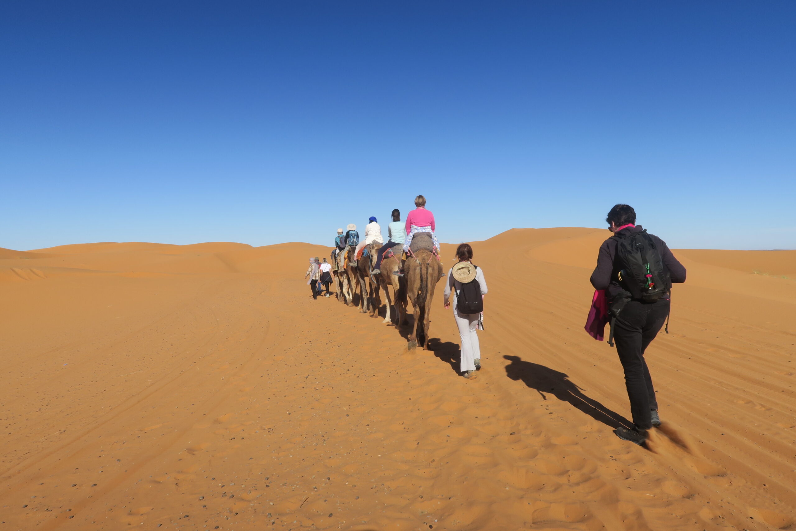 Les marches s’effectuent en compagnie d’un cuisinier, des muletiers et de leur mules et mulets ou des chameliers et de leurs dromadaires, portant le matériel et les bagages que l’on retrouve le midi et le soir. Elles sont cornaquées par un guide s’exprimant en français et dans d’autres langues également.